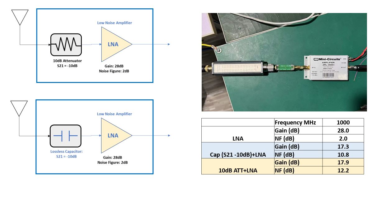 驗證這個模型我們用了以下兩個Case來驗證,分別在LNA輸入端串聯10dB衰減器與一個串聯的電容實際量測-10dB 分別用Y factor方式量測出Gain與Noise Figure與Noise Power。